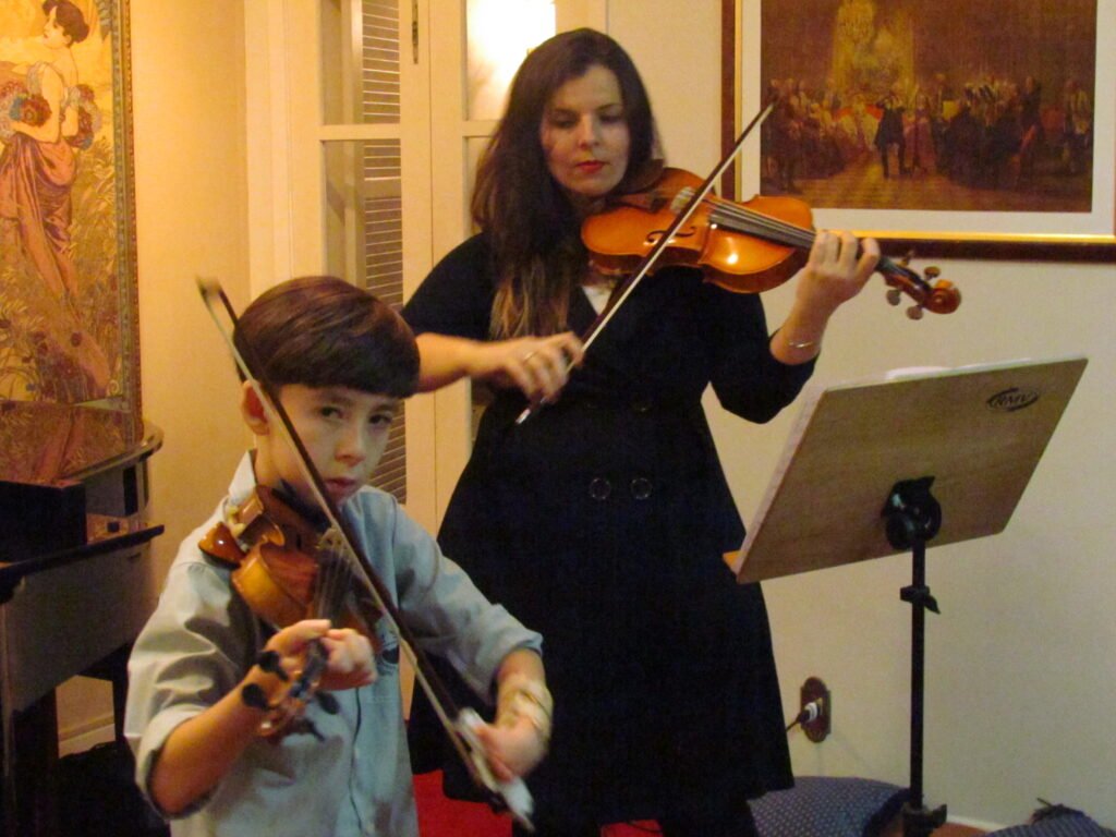 entre 2013 e 2015, eu estive toda semana na casa dela (mais de uma nesse meio tempo) para aprender, até me “formar” no primeiro dos 10 volumes do método Suzuki. O mais importante deles. E até hoje, o mais longe que eu fui nos métodos é o volume 4. Em 2015, eu tive a minha formatura do primeiro volume, ao lado da prof. Suellen. Uma apresentação simples, de um compilado de músicas que eu aprendi nesses dois anos.
